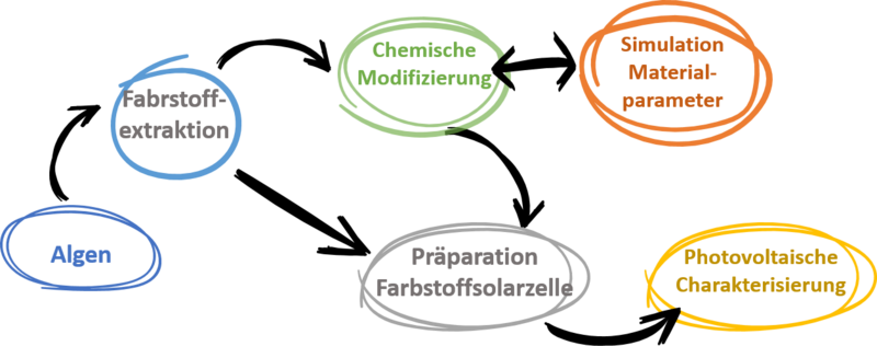 In diesem F&E Projekt sollen basierend auf der Arthrospira-Produktion bei Sea & Sun Technology GmbH (Trappenkamp, Schleswig-Holstein) natürliche Farbstoffe, insbesondere lineare Tetrapyrrole, aus Biomasse gewonnen und diese anschließend zur Herstellung und Charakterisierung von Farbstoffsolarzellen verwendet werden. Da diese Farbstoffe bisher kaum auf ihre Eignung in Farbstoffsolarzellen getestet werden, sind zunächst sowohl die Extraktionsmethoden für den Farbstoff als auch parallel dazu die Zellstrukturen für die Einbettung des Farbstoffs in eine Solarzelle grundlegend zu entwickeln. Nach ersten erfolgreichen photovoltaischen Testungen im Labor für Regenerative Energien, Nanotechnologie und Photonik im Solarhaus der THL sollen die gewonnenen natürlichen Farbstoffe durch chemische Synthese in ihren Eigenschaften gezielt angepasst werden, um höhere Wirkungsgrade und/oder eine bessere Langzeitstabilität in den Farbstoffsolarzellen zu erreichen. Dabei stehen vor allem, die Anbindung des Farbstoffes an den TiO2-Halbleiter, die intermolekularen Wechselwirkungen in der Farbstoffsolarzelle, verbesserte Ladungsträgerinjektion und -transporte sowie die technologische Verbesserung der Zellstruktur im Fokus.