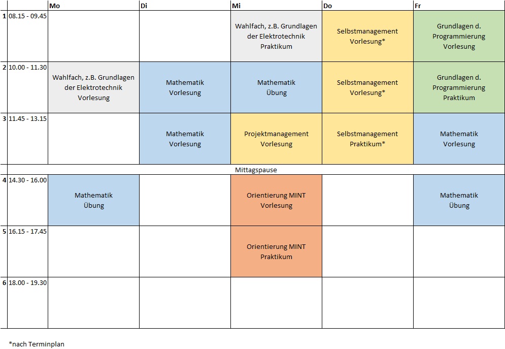 Wenn du wissen möchtest, wie dein Tagesablauf aussehen könnte, wirf doch mal einen Blick in den exemplarischen Stundenplan. Bedenke aber, dass im Studium ein großer Teil der Arbeit von dir zu Hause geleistet werden muss. Zu den Unterrichtszeiten kommen also noch Selbststudiumsstunden in vergleichbarem Umfang dazu.