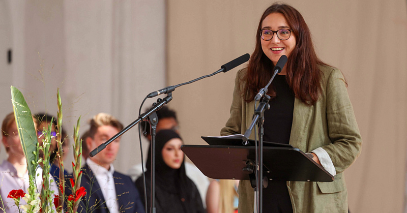 Frini Luise Leufer, Absolventin des Masterstudiengangs Mechanical Engineering, blickte in der Abschlussrede auf ihre Studienzeit zurück: Heute geht es nicht nur um Rückblick, es geht auch um die Zukunft. Wir stehen am Anfang von einem ganz neuen Kapitel, in das wir nicht nur unser Wissen mitnehmen, sondern auch die Erfahrungen und Freundschaften, die wir gesammelt haben. Und vielleicht am Wichtigsten: die Erkenntnis, dass wir mehr schaffen können, als wir uns manchmal zutrauen. Frini Luise Leufer weiß schon, was in Zukunft auf sie zukommt. Sie hat eine Stelle als wissenschaftliche Mitarbeiterin bei Prof. Nadine Madanchi an der TH Lübeck gefunden und geht ihren Weg weiter in Richtung Promotion.