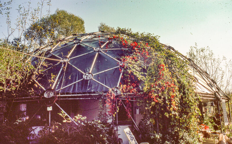 Geodätische Kuppel, teilweise von herbstlichen Rankpflanzen überwachsen.