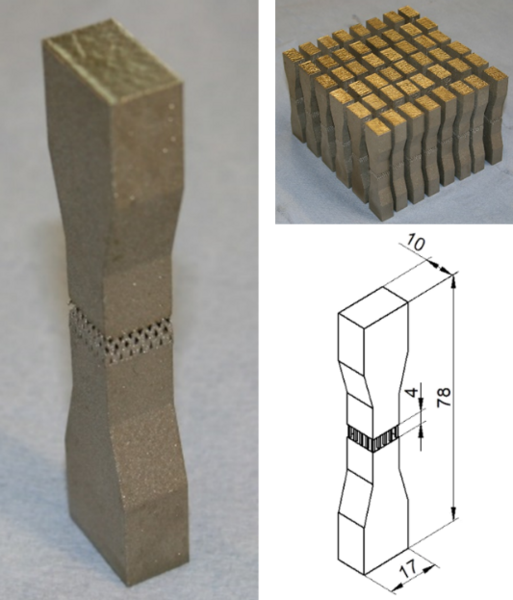 Bild 2: Das Bild ist in drei Abschnitte unterteilt. Links befindet sich ein längliches, metallisches Bauteil mit einer verengten Mittelpartie, in der eine feine Gitterstruktur sichtbar ist. Rechts oben ist eine Draufsicht auf eine gestapelte Gitterstruktur aus dem gleichen Material zu sehen. Rechts unten befindet sich eine technische Zeichnung, die das Bauteil mit Maßen und Details schematisch darstellt. Das Bild verdeutlicht die Möglichkeiten additiver Fertigung, komplexe Strukturen wie Gitter in Metallbauteile zu integrieren und diese präzise zu dokumentieren.